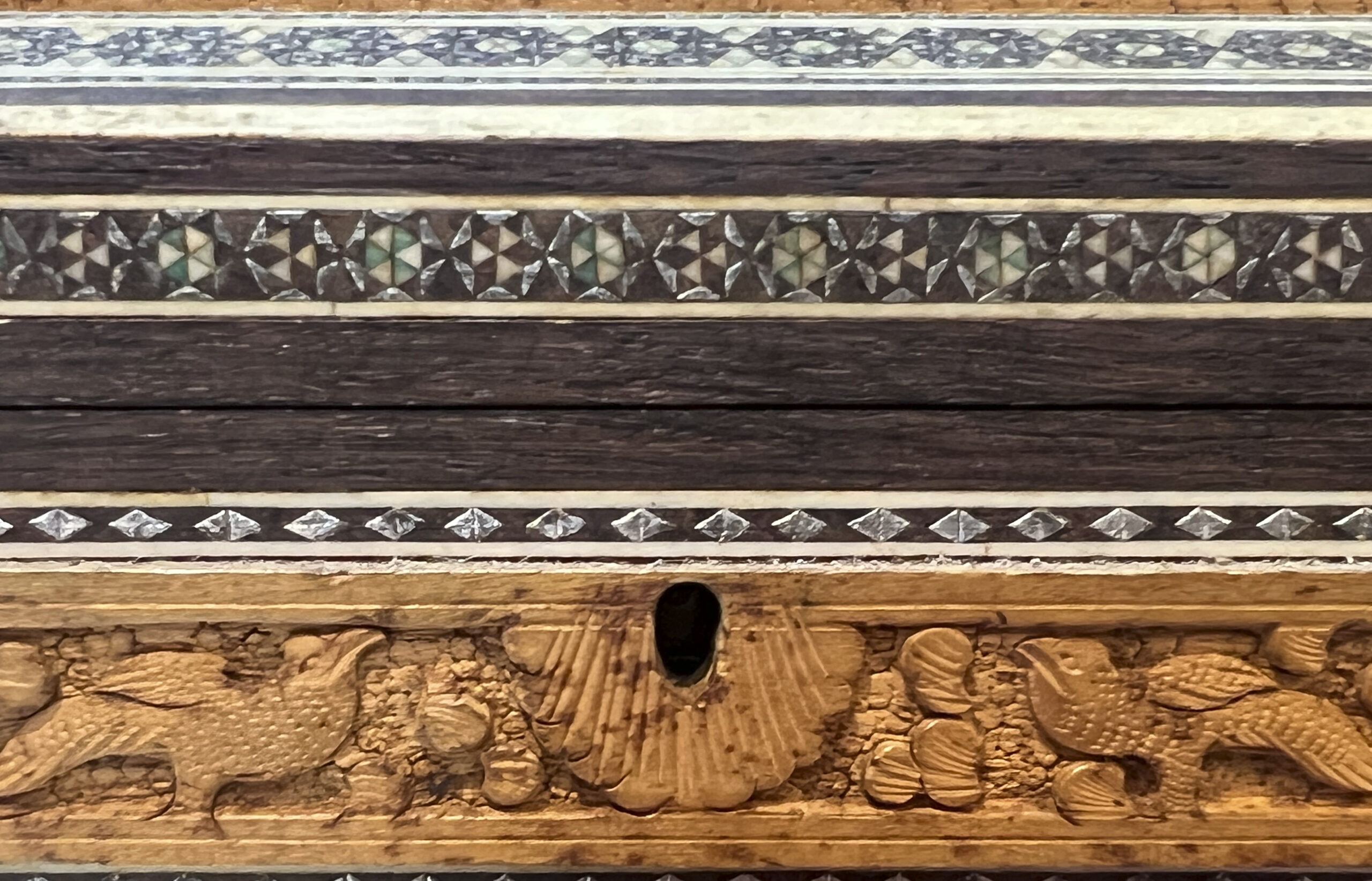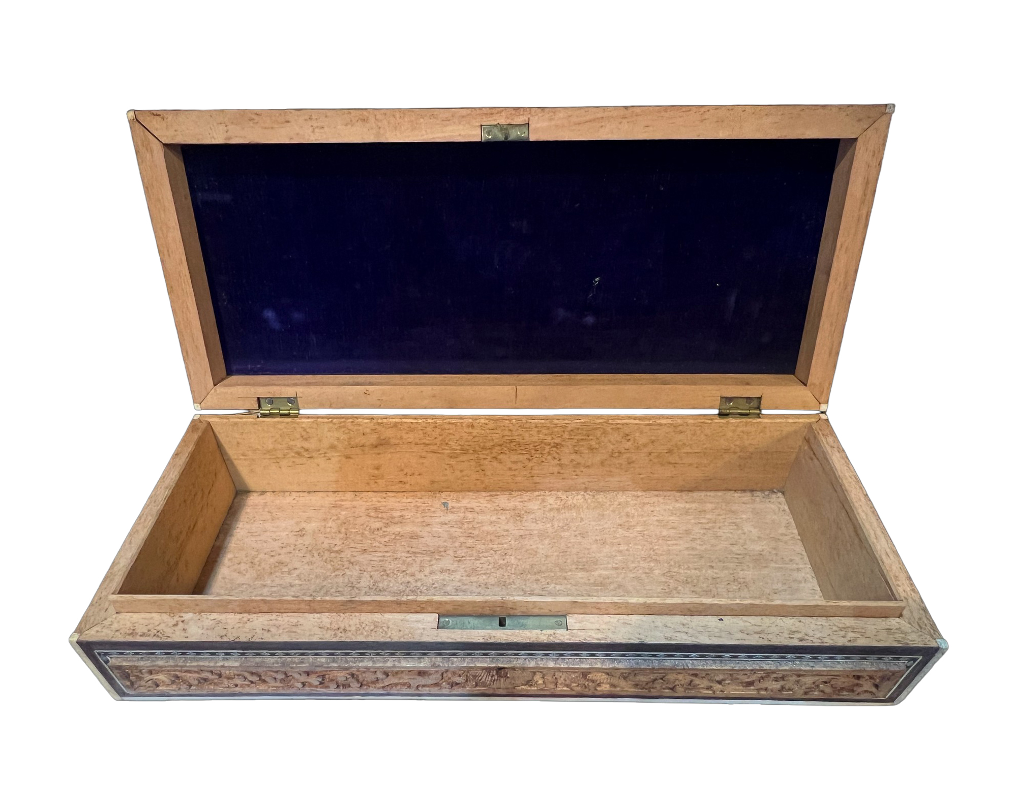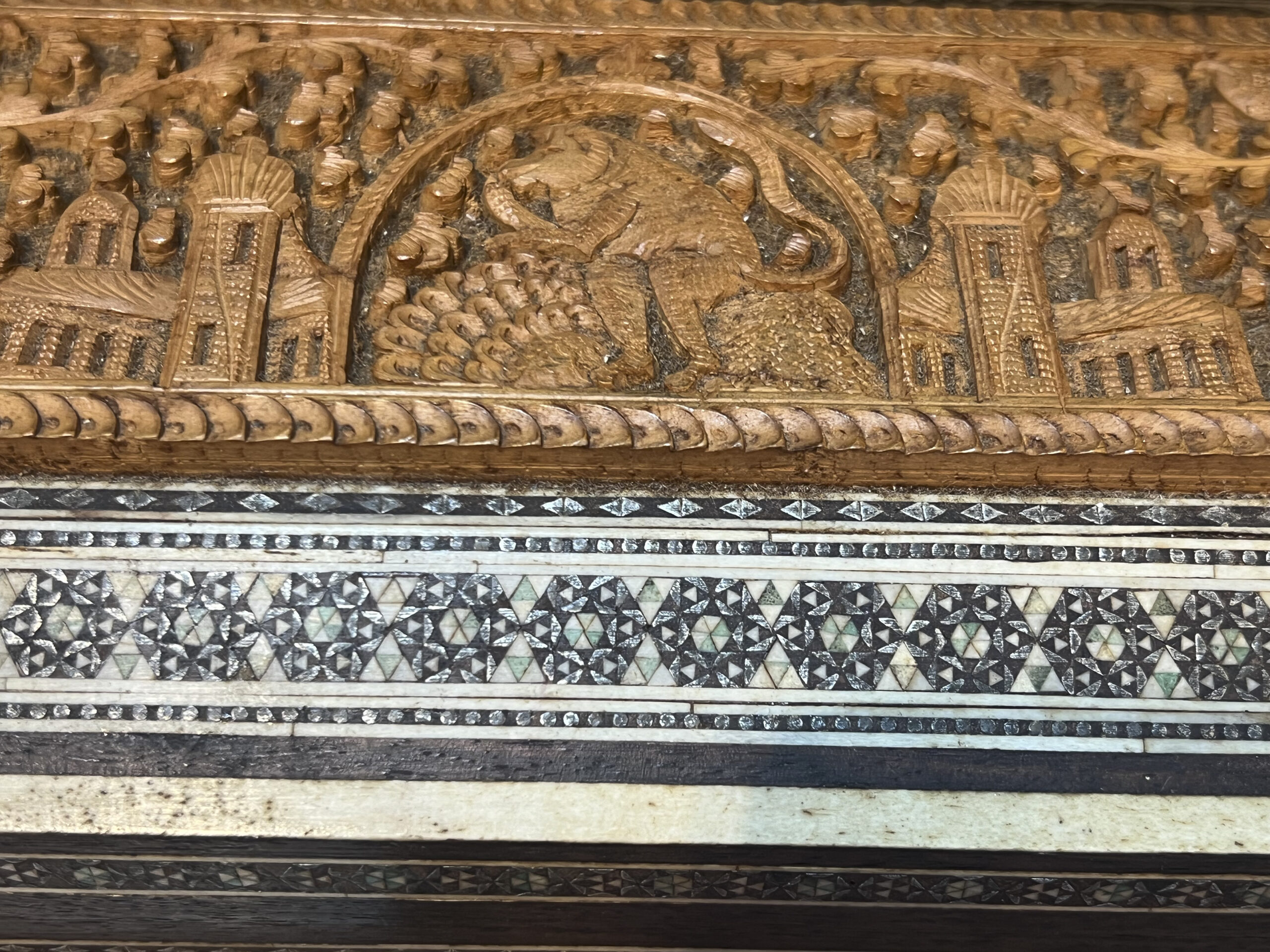 The rectangular box, composed of a dark wood, is covered by varying materials for ornamentation. The most important feature is found at the centre of the lid – a protruding rectangular frieze carved out of sandalwood. A ripple molding frames a narrative scene that is crafted expertly. Seated atop a rock, under a large arch, is an animal, which appears to be a side profile of a monkey with its raised tail. Connecting the arch on either side are double-storied buildings with a tall domed tower. The focus on the animal is apparent, not only because of the central position it occupies in the scene but also because of hierarchical scaling. To maintain symmetry, a peacock is placed on either end, perched on swirling vines that fill up the rest of the frieze. Bands of minute geometric shapes, including hexagonal and rhombus elements, are inlaid in silver. On each side, strips of carved sandalwood in the form of floriated vines and birds are placed. Opened using its hinged lid, the interior of the box remains bare only with remnants of a felt lining. The shallow height of the box indicates it was purposed to hold perhaps small, valuable objects. This box, a small but important piece of colonial history, marks the versatility of the artisans who were able to handle and mold multiple mediums with intricate artistry.