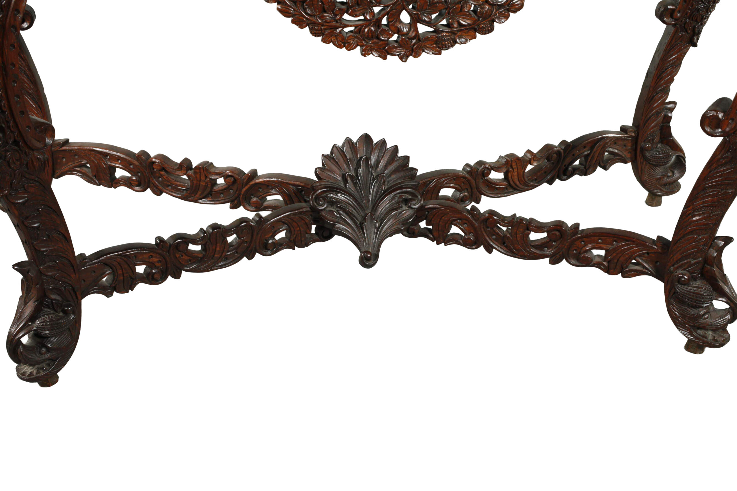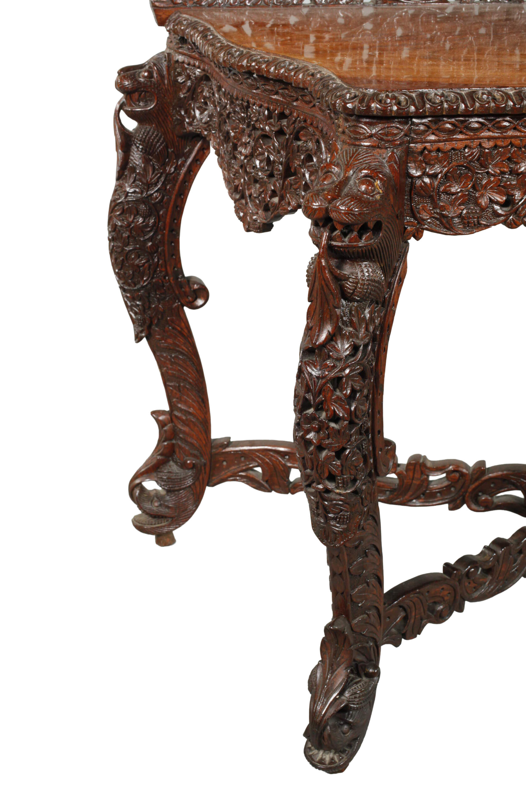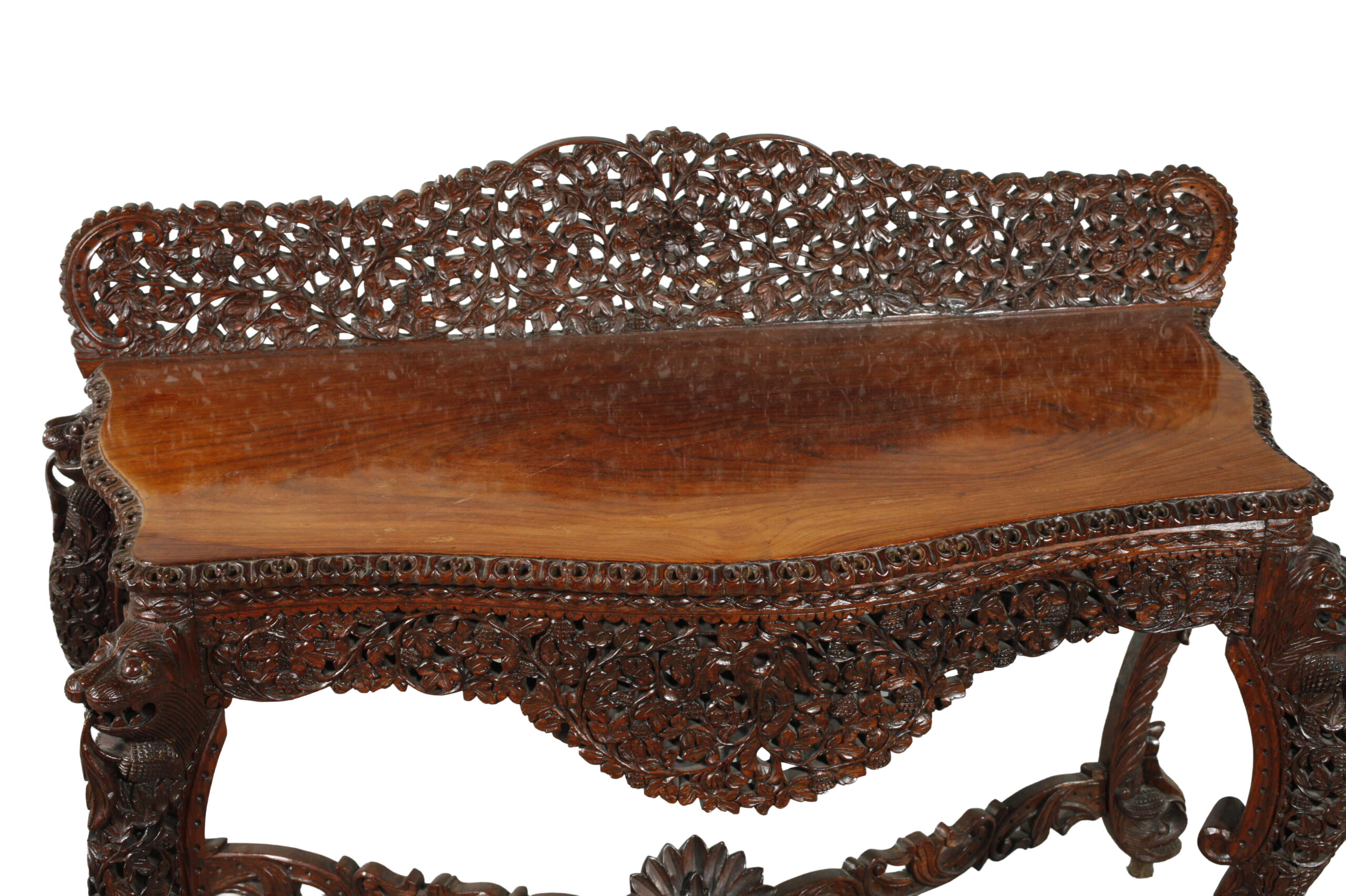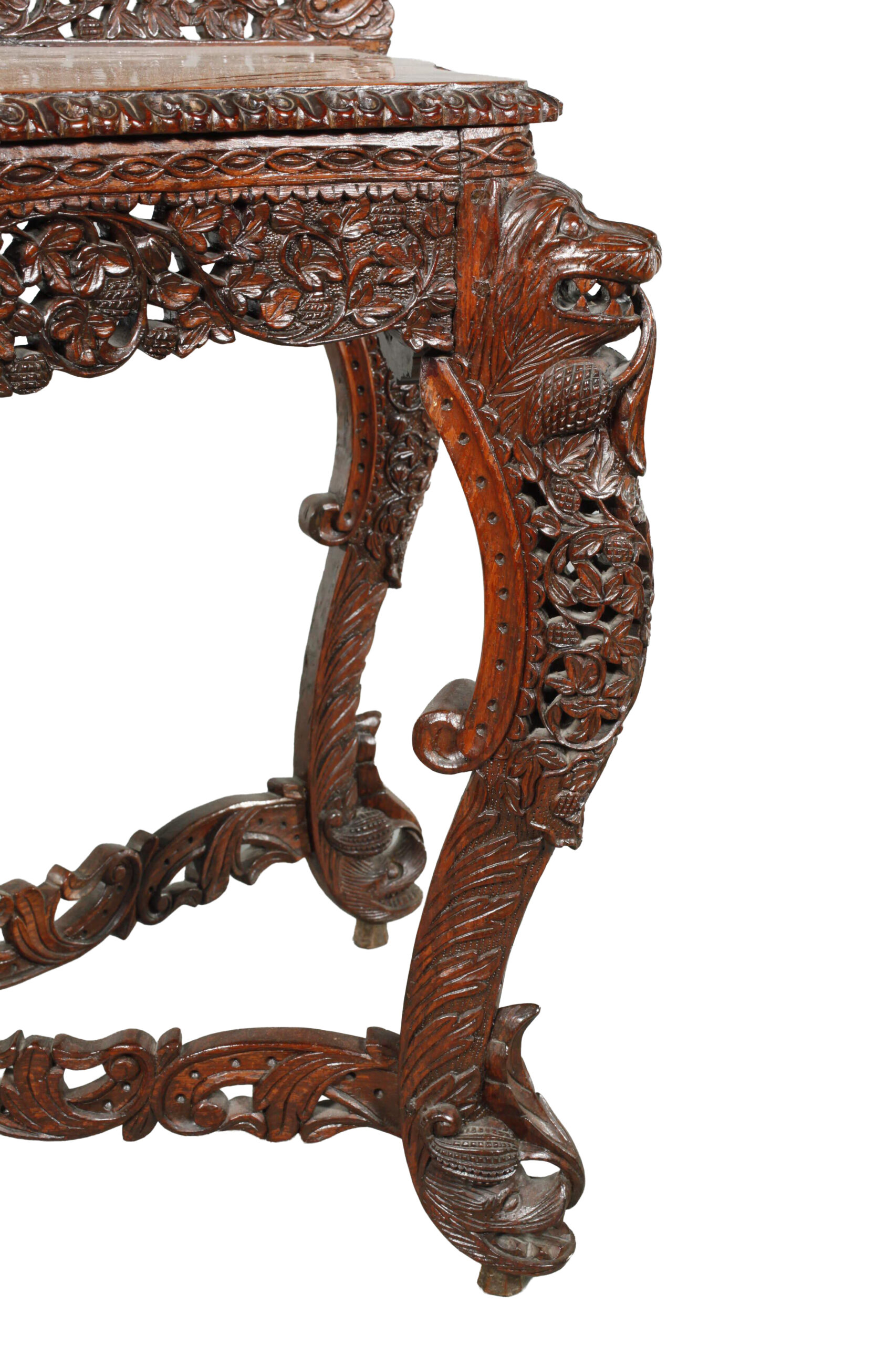 India, Height: 97 cm, Width: 120 cm, Depth: 65 cmThe heavily ornamented console table, crafted from a sturdy reddish-brown wood characterises the cultural synthesis that defines Anglo-Indian furniture. Resting on four cabriole legs, the table features a polished top with visible wood grains and is supported by a densely carved raised back and aprons. Covered in swirling veins, leaves and flowers, this table with floriate embellishments celebrates superior craftsmanship.
