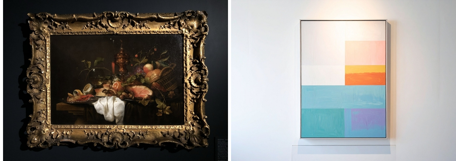 A common mistake is choosing a frame to match the sofa or the curtains. But furniture changes, art is often forever. Paintings usually require different approaches to framing, depending on the subject matter and material language. As seen below, modern abstract works tend to benefit from a lighter, more contemporary approach. Floater frames work particularly well here, allowing colour and form to remain the primary focus. By contrast, classical oil paintings often demand visual weight, whether through traditional gilded frames or more contemporary deep-set ones. In case of older paintings especially, an ornate gilded frame helps situate the work firmly within its historical context. Such frames carry their own sense of time, echoing the history of the object they contain.